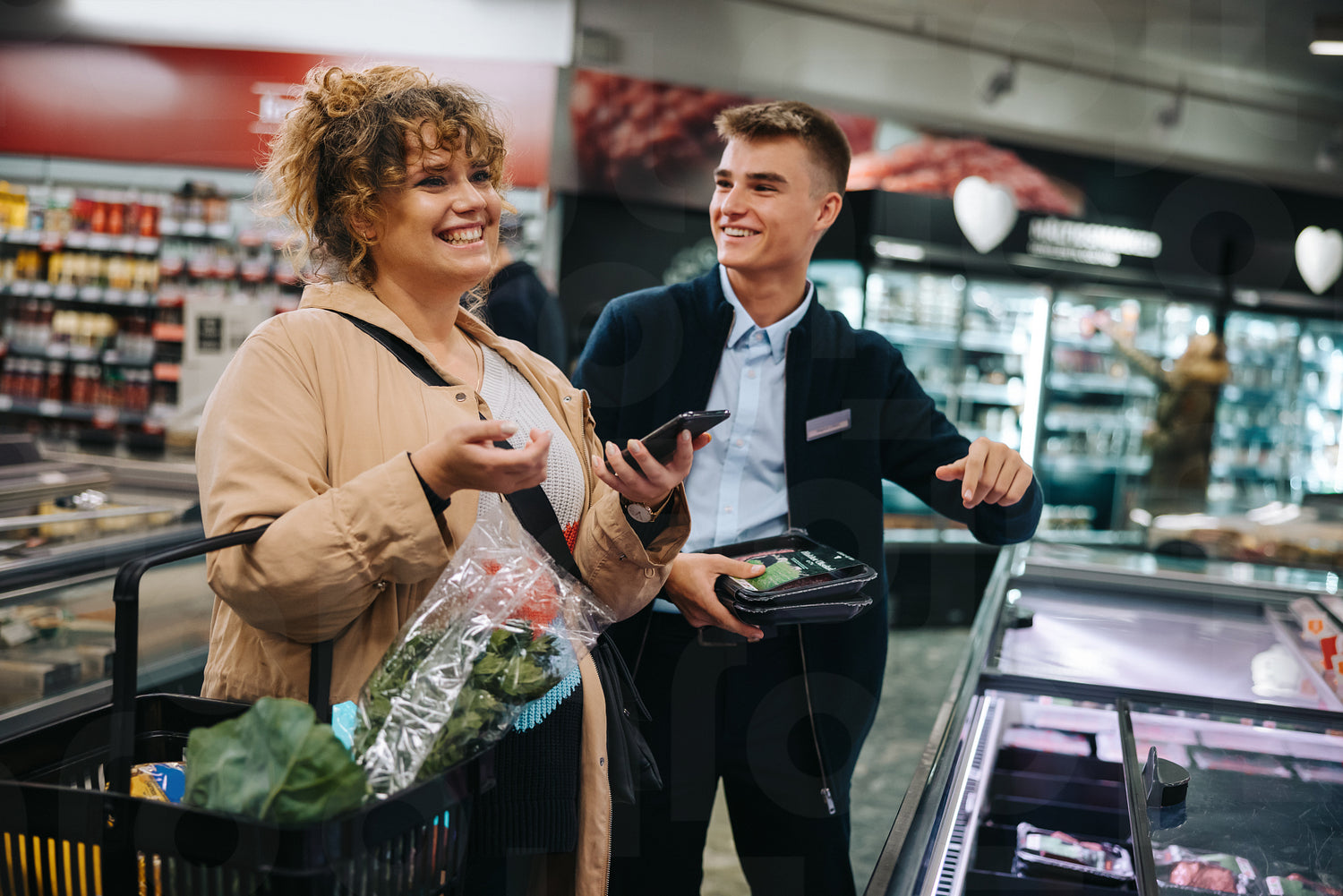 Smiling female shopper with assistant in grocery store. Happy woman customer shopping in supermarket.