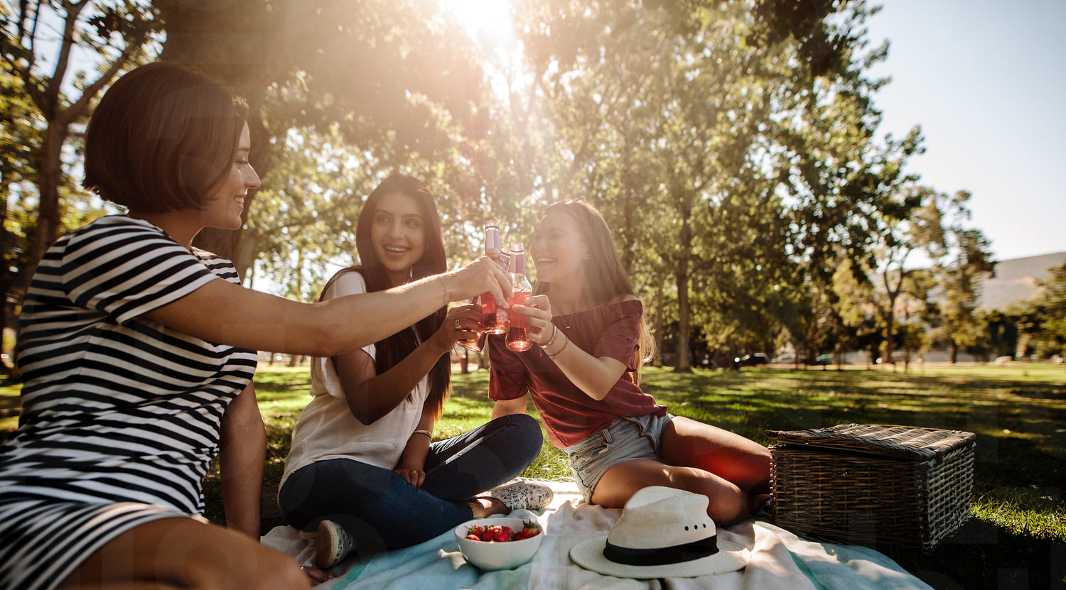 Group of young female friends toasting with bottles of beer and having fun outside in a park. Girls having beers at picnic.