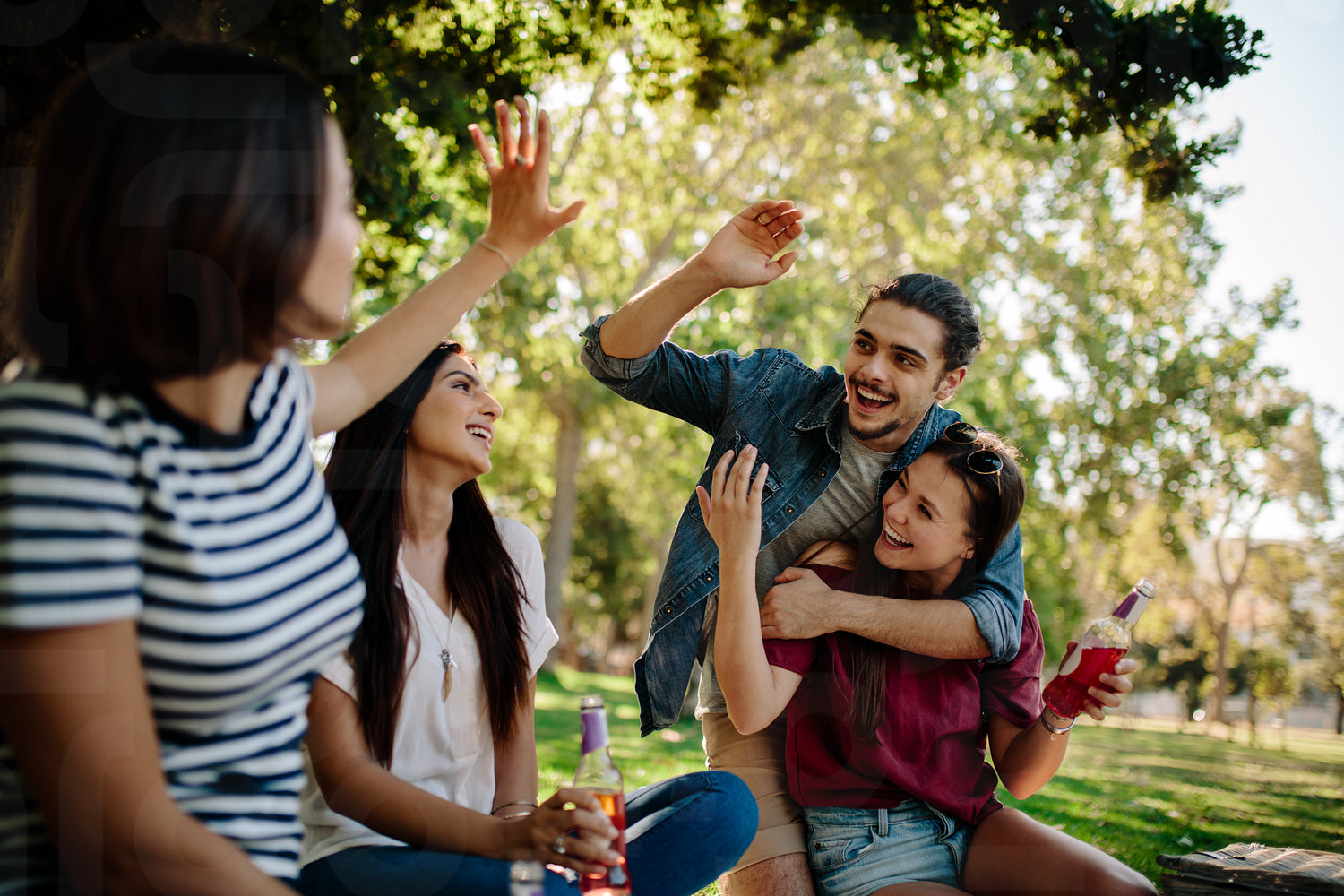 Young man giving high five to female friends at park. Group of friends enjoying on picnic outdoors.