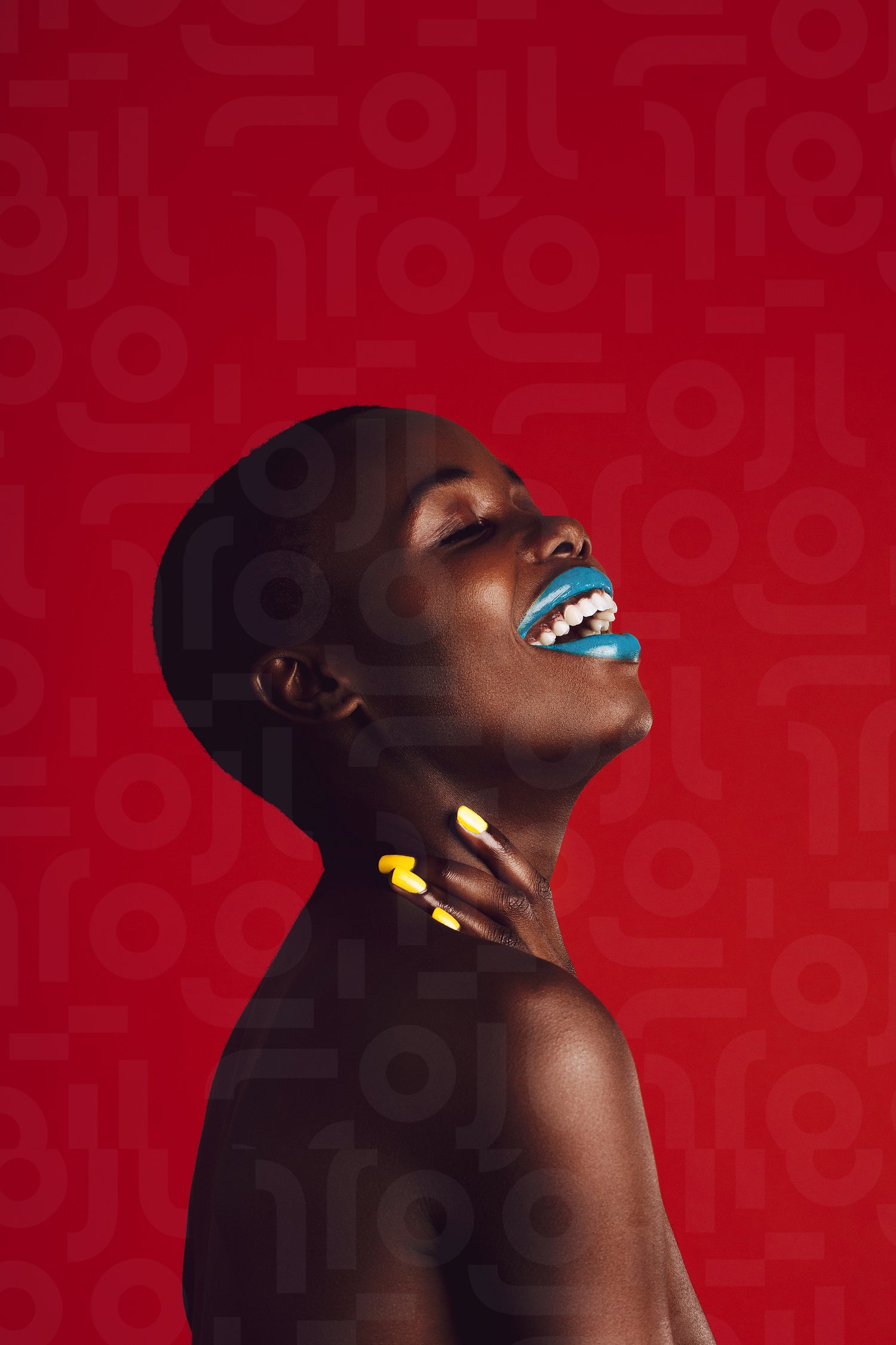 Smiling african woman with colorful makeup. Closeup of a african female model with vibrant makeup on red background.