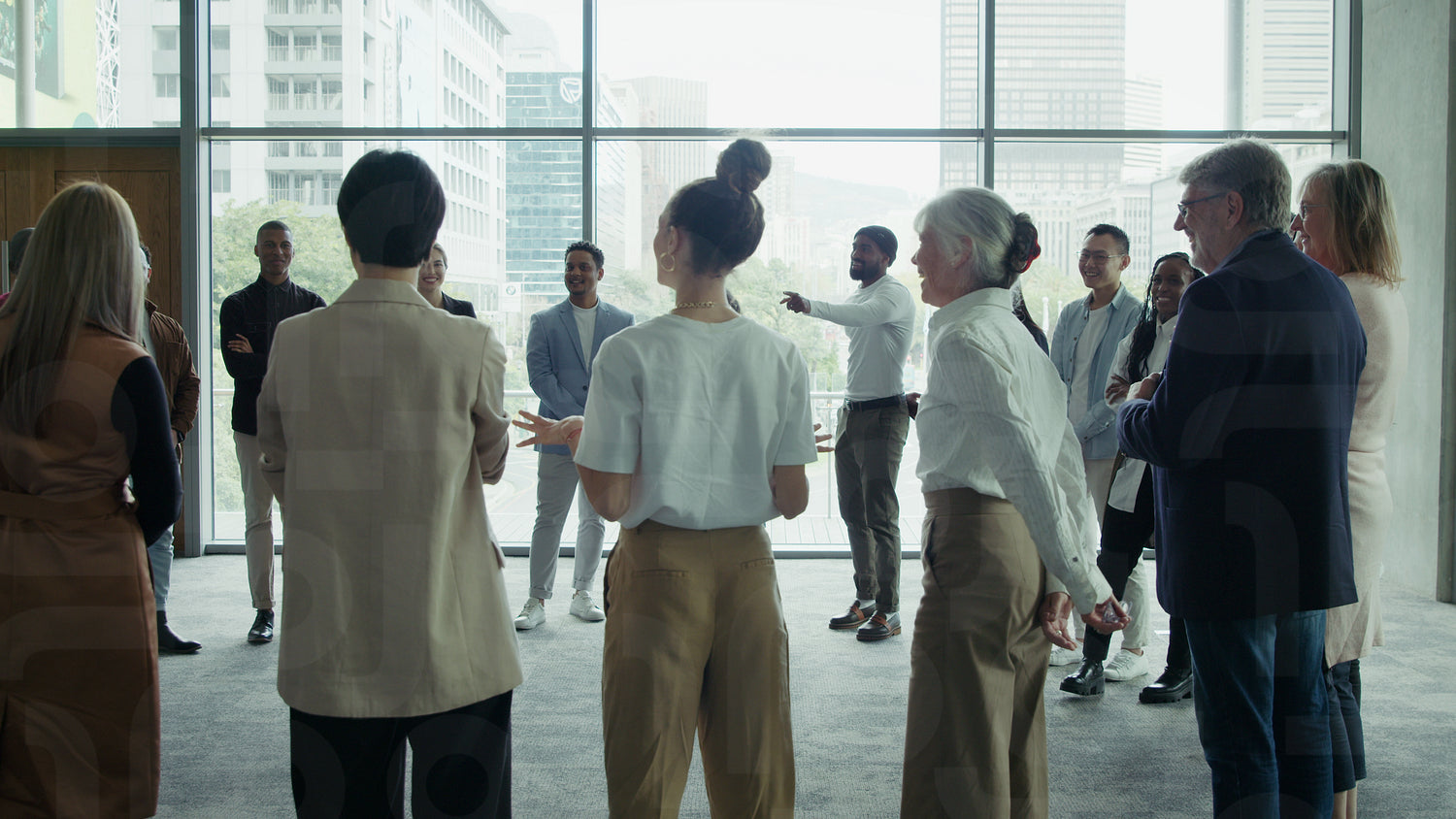 Business professionals in a spacious room with city views. They gather in a circle, conversing and networking at a corporate event, fostering connections and collaborative spirit.