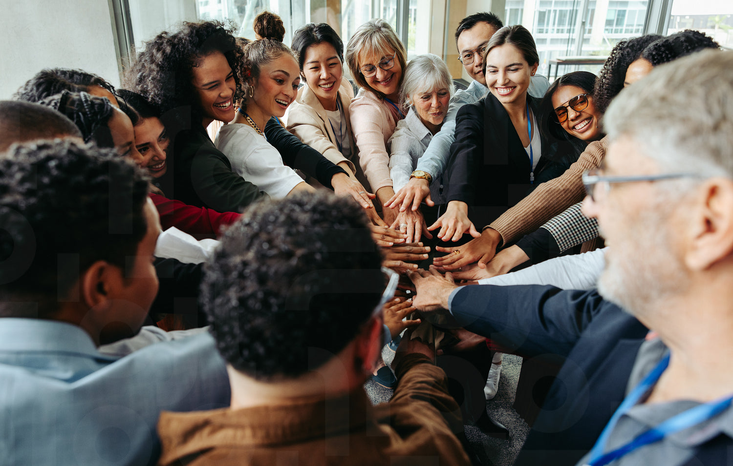 Diverse group of colleagues demonstrating teamwork and unity by putting their hands together during a corporate teambuilding conference in a modern office setting.