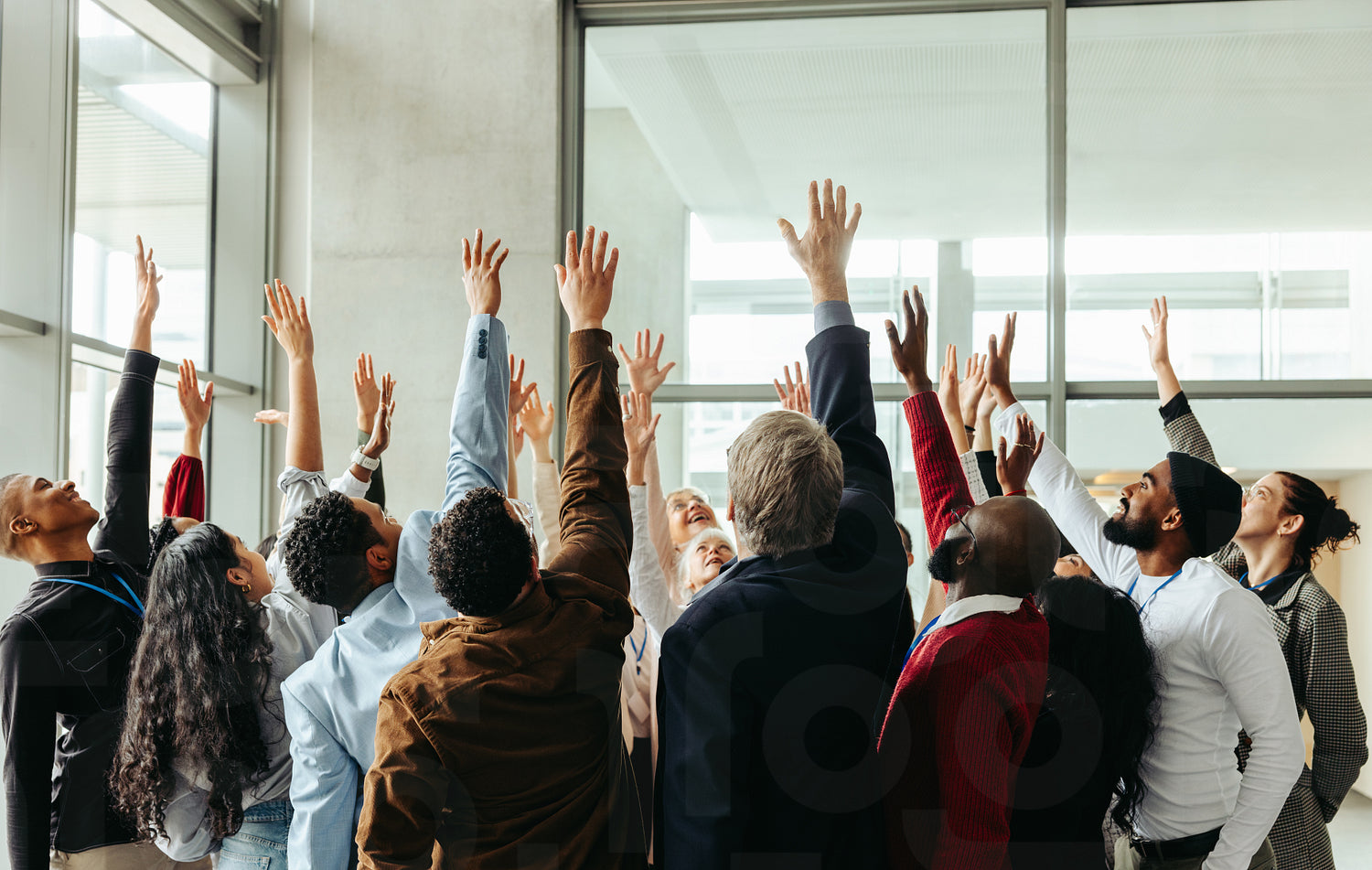 Diverse group of people showing excitement and teamwork by raising hands during a business seminar in a modern office environment.