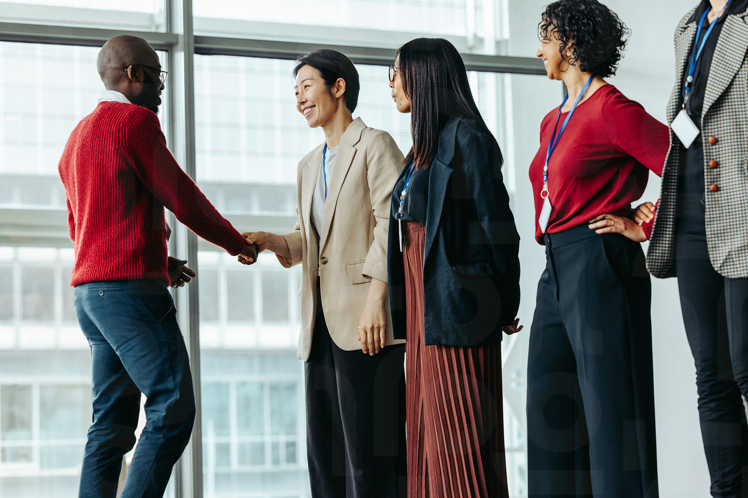 Successful team introduction during a corporate meeting. Diverse professionals engaging in a positive interaction, fostering a collaborative office environment.
