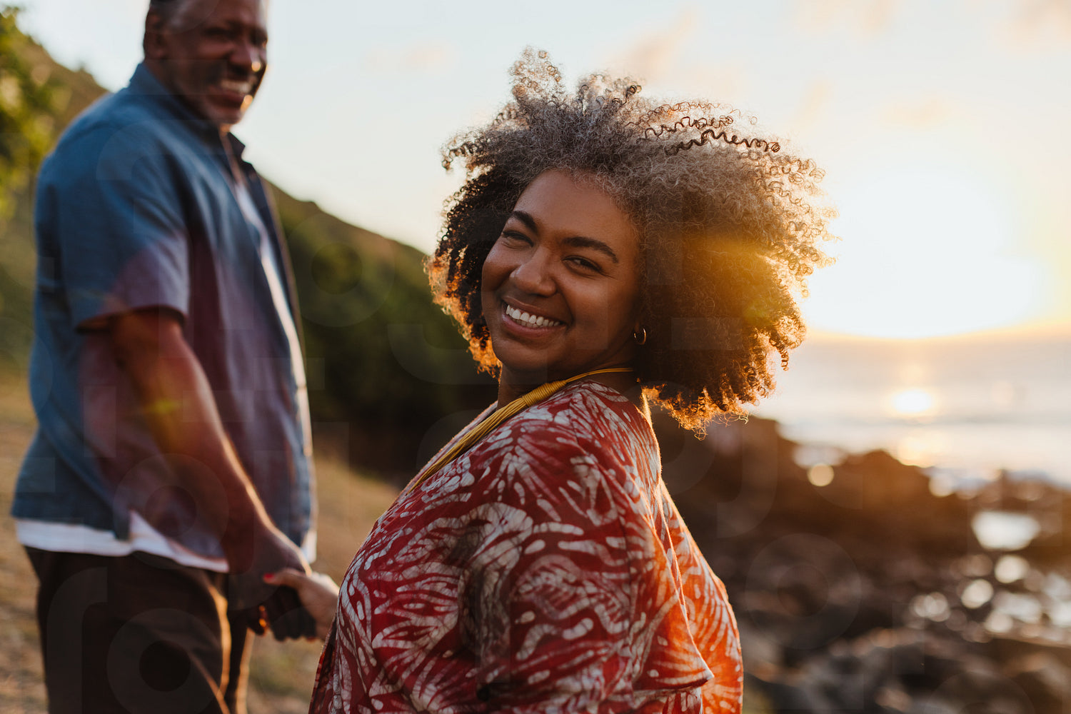 Beautiful mature woman with afro hairstyle enjoying a sunset by the beach. Capturing a joyful moment with nature in the background.