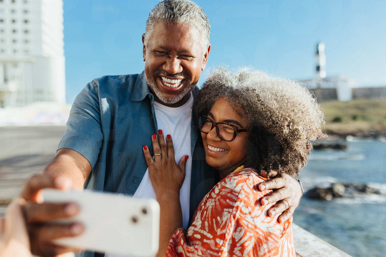 Retired happy pair taking a selfie on vacation by the ocean in Bahia