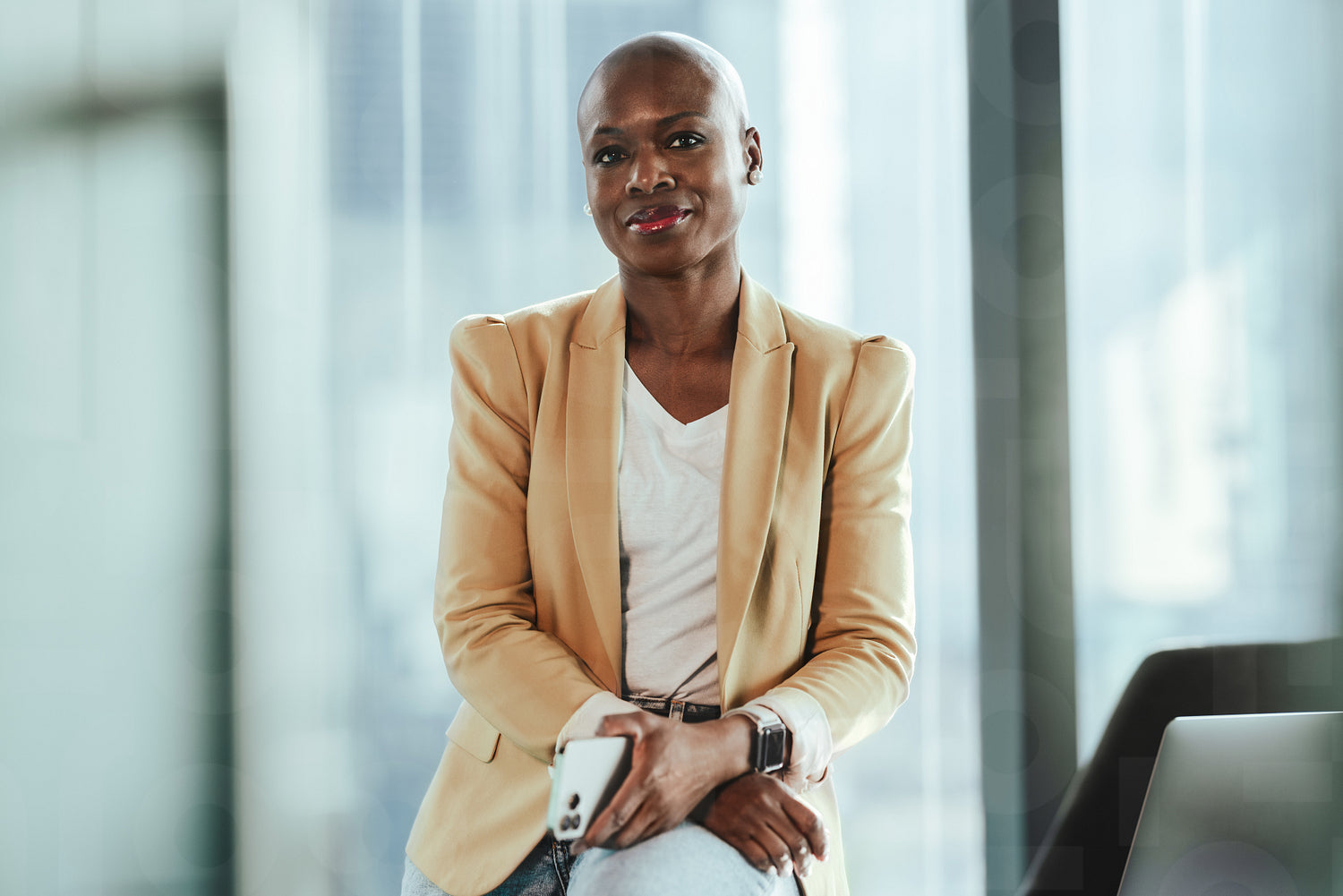 Confident mature business woman sitting at her desk in a corporate office. She is holding a smartphone and looking directly at the camera with a confident expression. She embodies success and professionalism in the workplace.