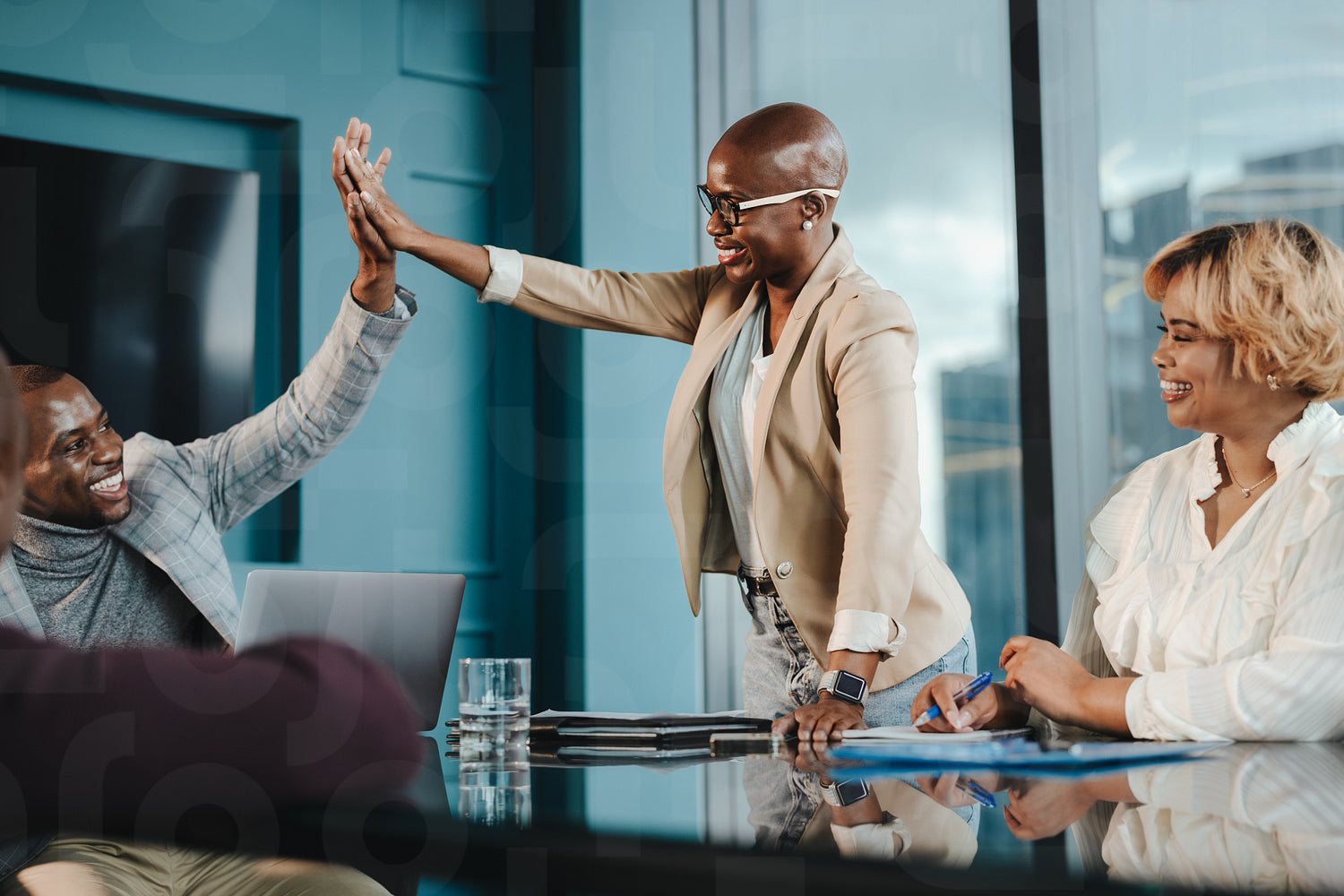 Professional colleagues celebrating success in a business meeting. Men and women in a corporate office, happily clapping hands. Demonstrating great teamwork and a positive work environment.