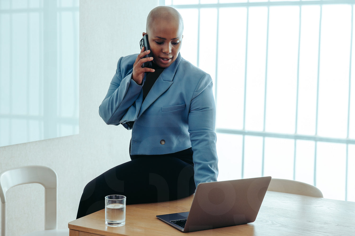 African-American businesswoman expertly juggles tasks, using her smartphone and laptop simultaneously in a bright, modern office. Her confidence reflects effective multitasking and professional focus.