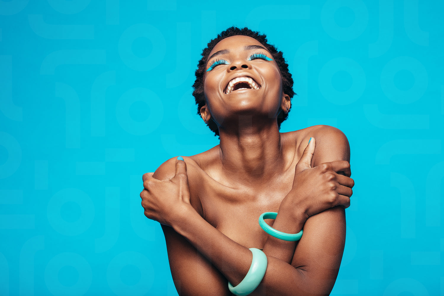 Cheerful african woman hugging herself against blue background. Female model wearing vibrant makeup laughing in studio.