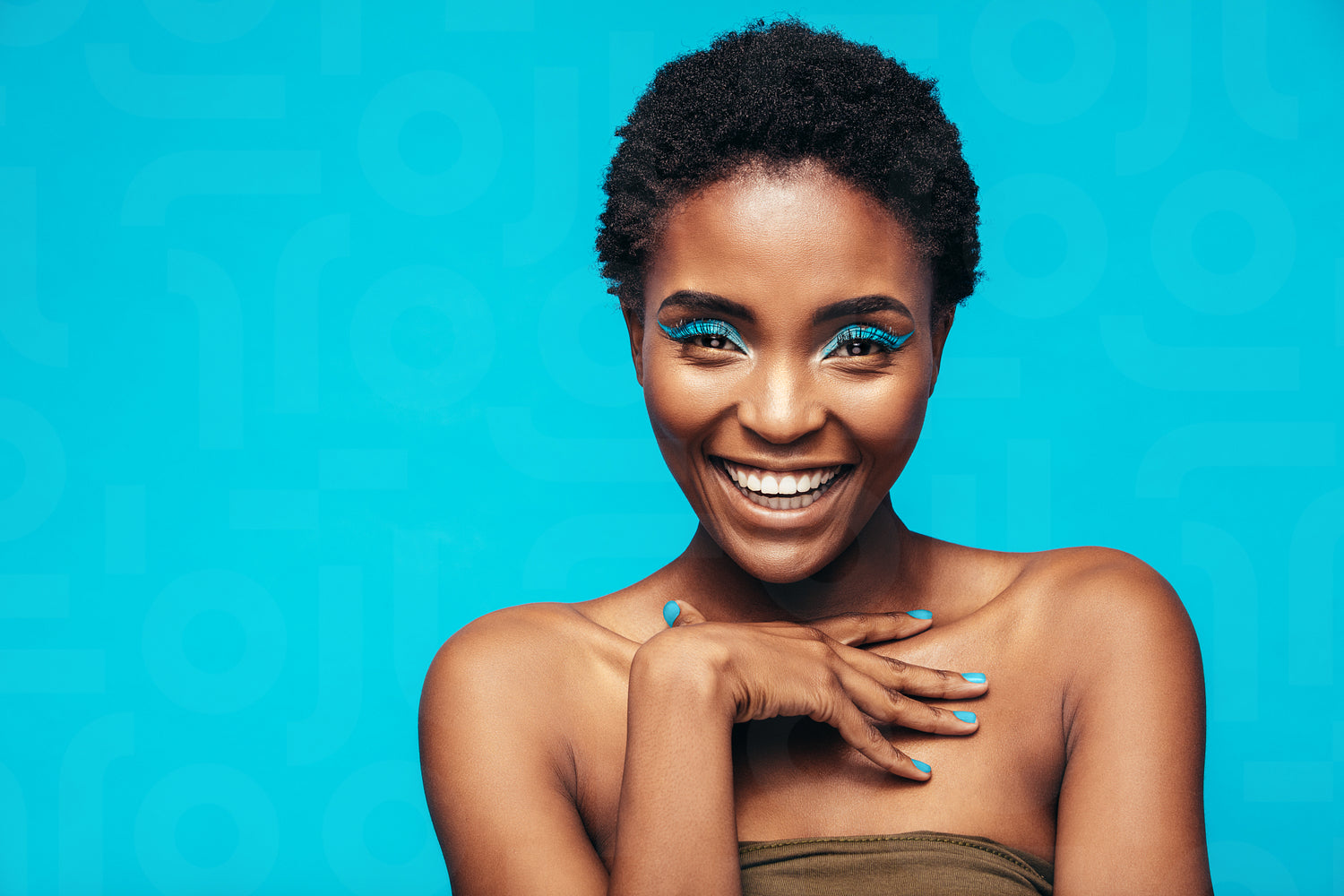Close up of beauty shot of woman with blue eye shadows. Portrait of female model with vivid makeup laughing on blue background.
