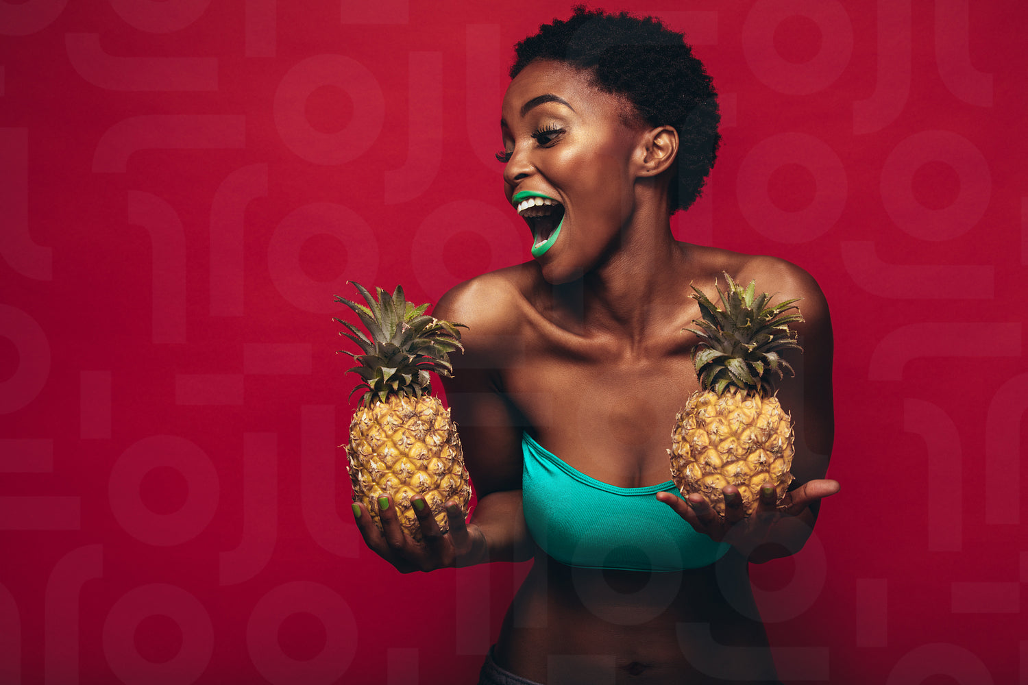 Black woman with pineapples in hand. Laughing female fashion model laughing over red background.