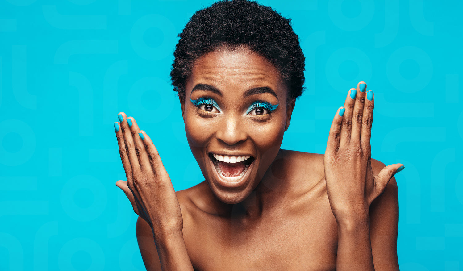 Close up of woman with blue eye shadow and nail paint against blue background. Excited female model showing her vivid makeup.