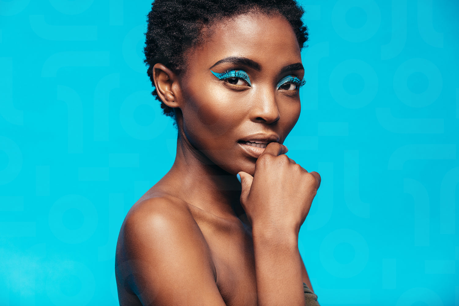 Close up of sensual african female model with makeup against blue background. Young woman with vivid makeup looking at camera.
