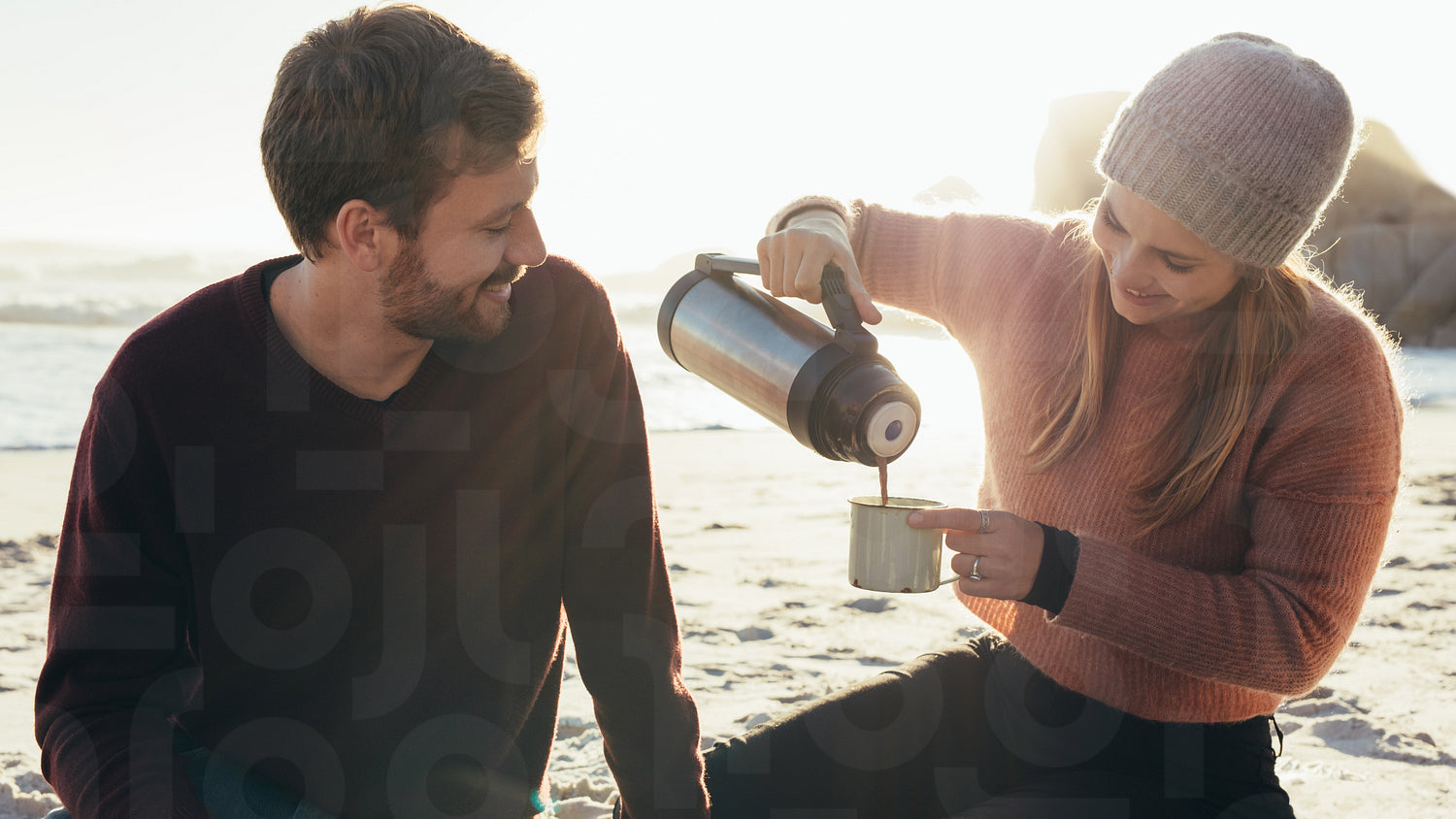 Beautiful young couple having coffee at the beach. Woman pouring coffee in a cup for man at sea shore.
