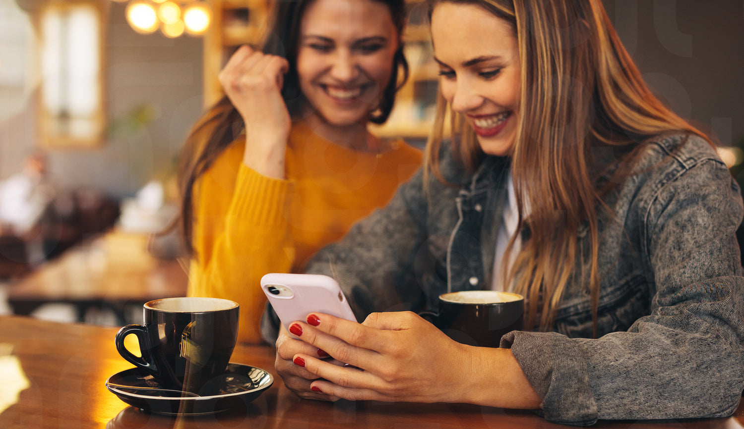 Two women sitting in a cafe looking at a mobile phone and laughing. Best friends hanging out at a coffee shop.