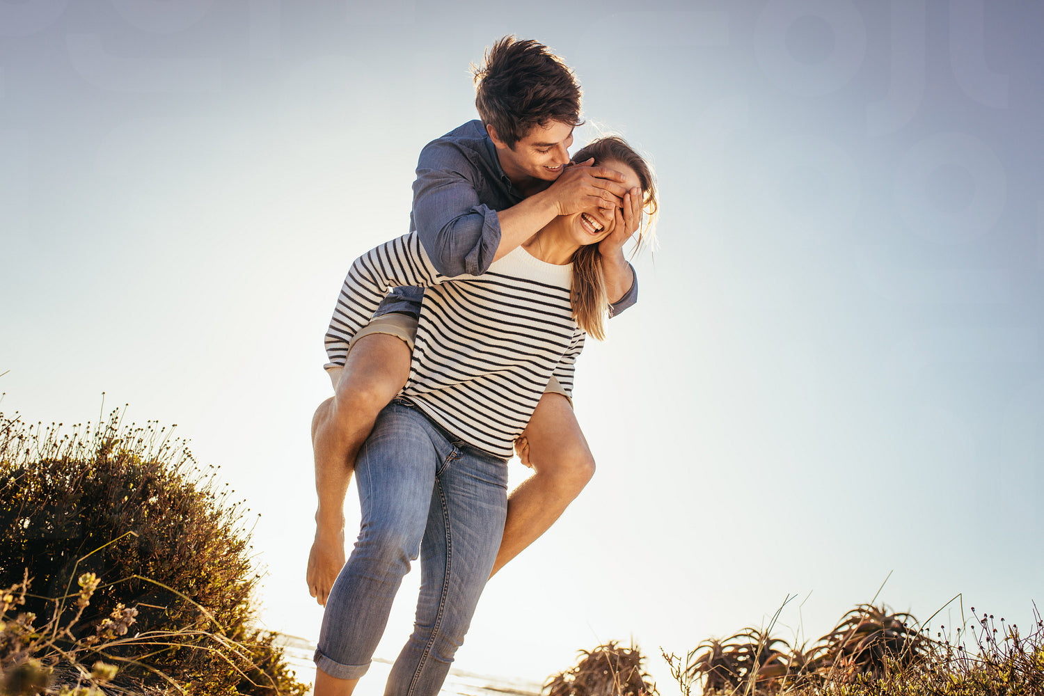 Happy woman carrying her boyfriend on her back on the beach on a sunny day. Man piggy riding on his girlfriend closing her eyes with his hands.