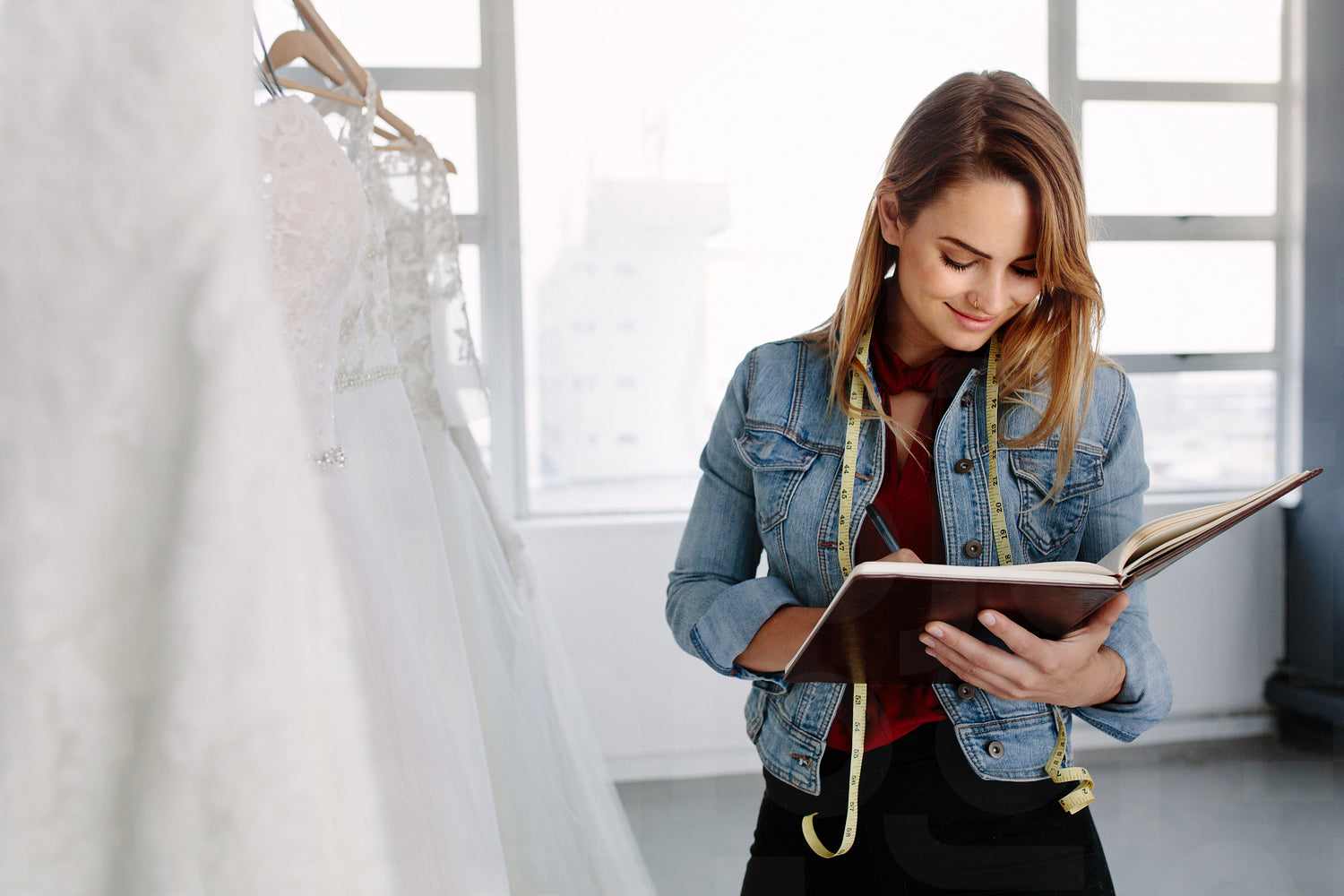 Female fashion designer working in bridal wear store and writing in a diary. Female bridal store owner in her boutique.