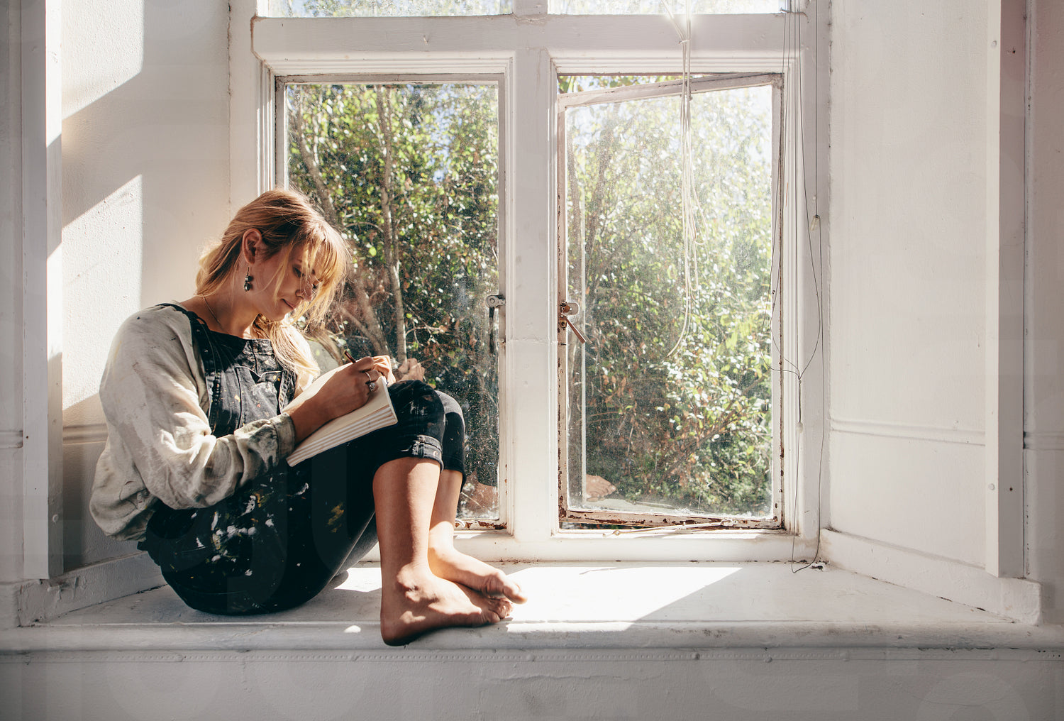 Side view shot of female artist in workshop making a sketch in book. Female painter sitting at the window and drawing.