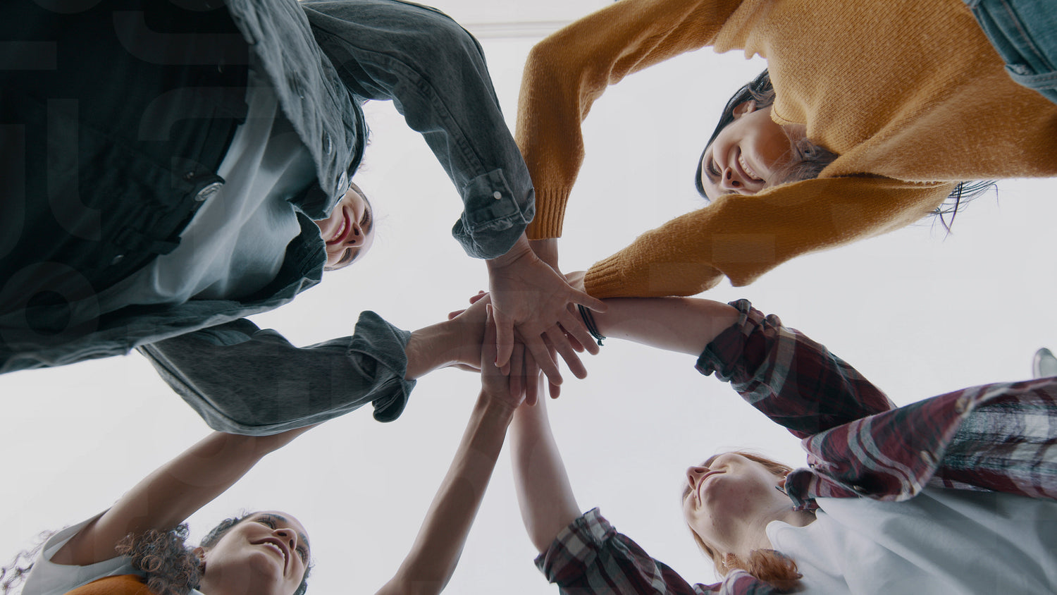 Group of female friends stacking hands in a huddle. Multiracials girls enjoying outdoors.