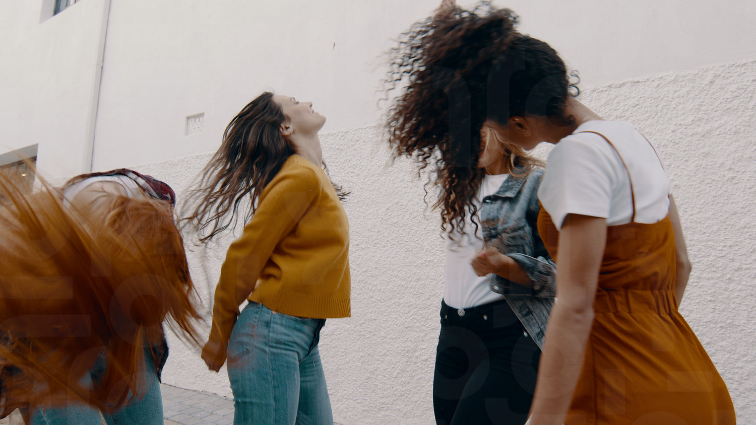 Group of female friends dancing together and blowing confetti. Group of women enjoying dancing outdoors.