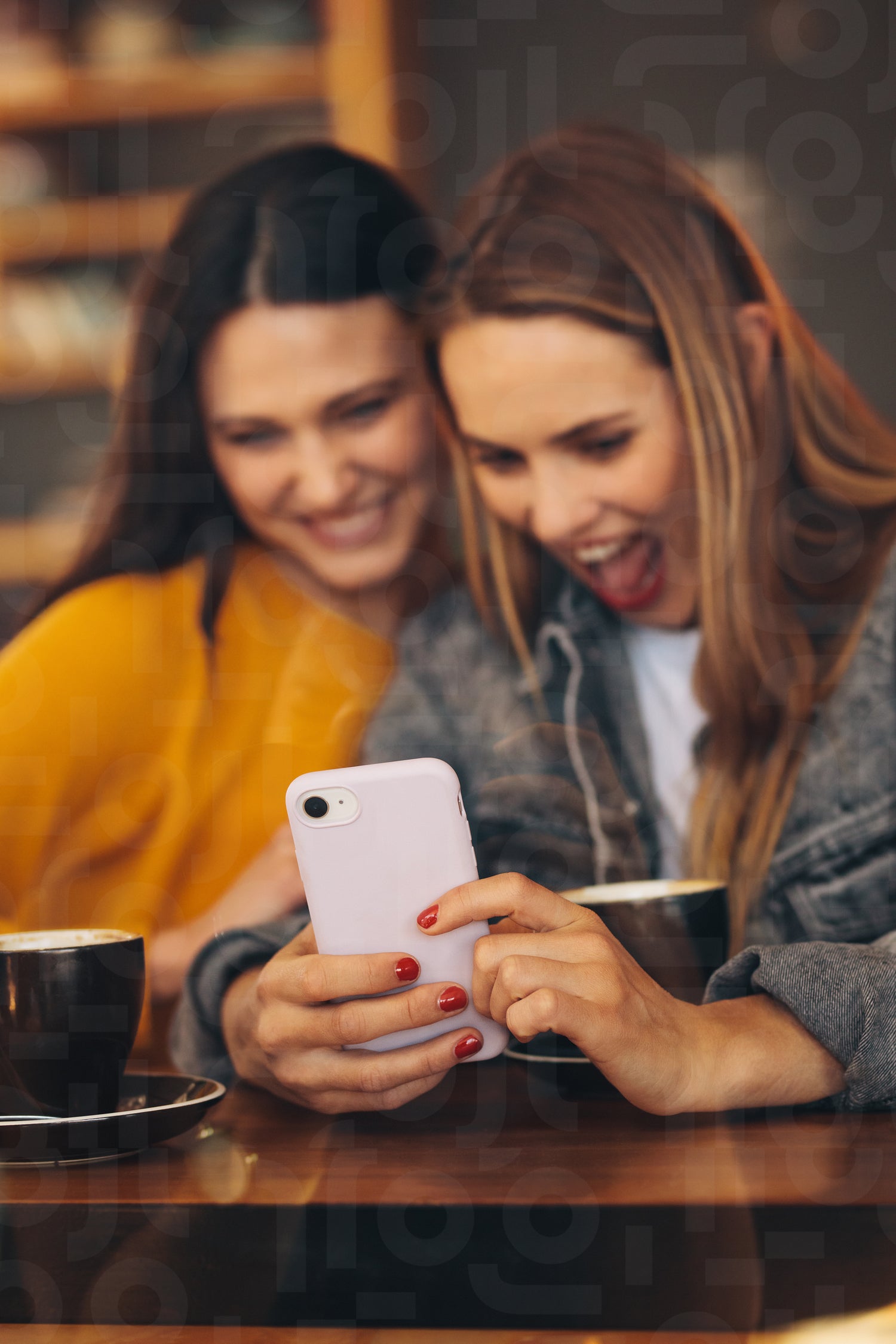 Female friends meeting at coffee shop and looking at mobile phone. Woman showing something funny on her phone to friend.