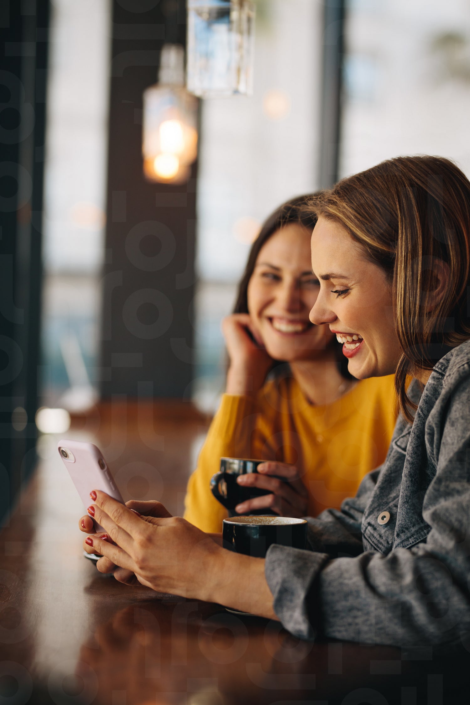 Young friends sitting in a cafe looking at a smartphone and smiling. Friends sitting in a restaurant with one woman showing something interesting to her friend.