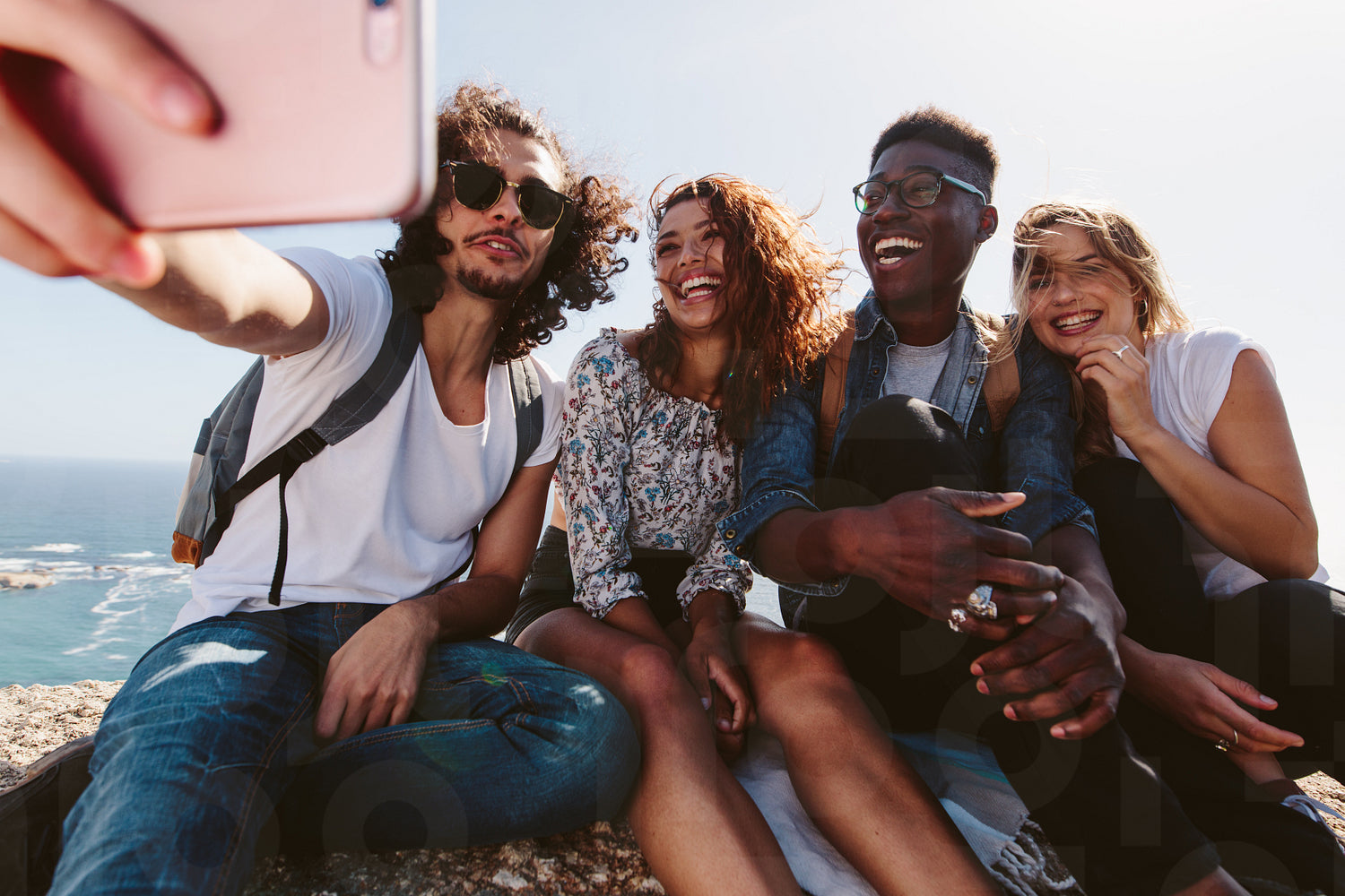 Group of hikers relaxing and taking selfie