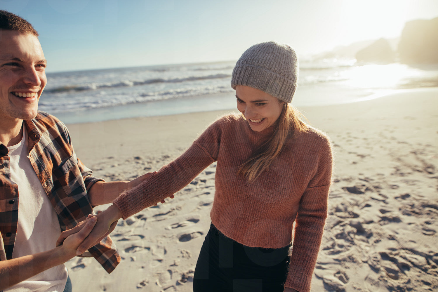 Happy young couple on the beach at evening. Man holding hand of young smiling at the sea shore.