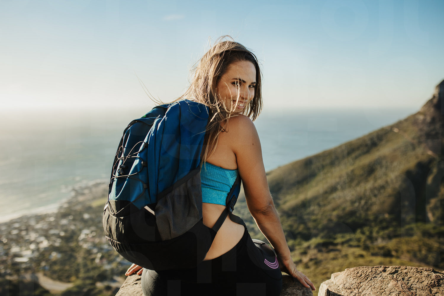 Rear view of a woman with backpack sitting on the cliff. Female hiker relaxing on mountain top glancing back at camera and smiling.