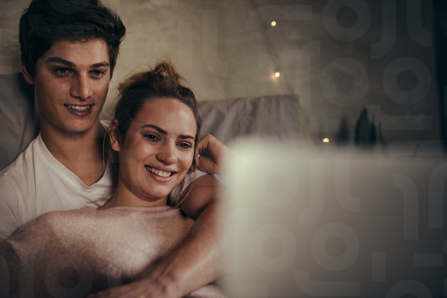 Hygge couple watching video on laptop in bedroom. Loving young man and woman with laptop on bed.