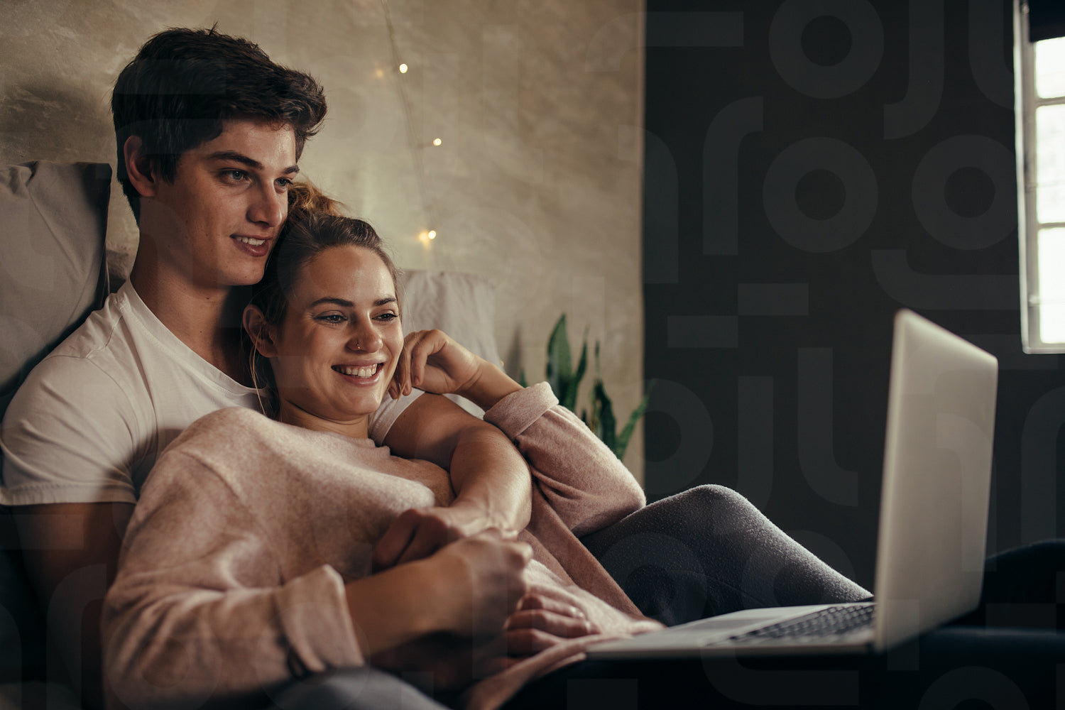 Hygge couple with laptop on bed