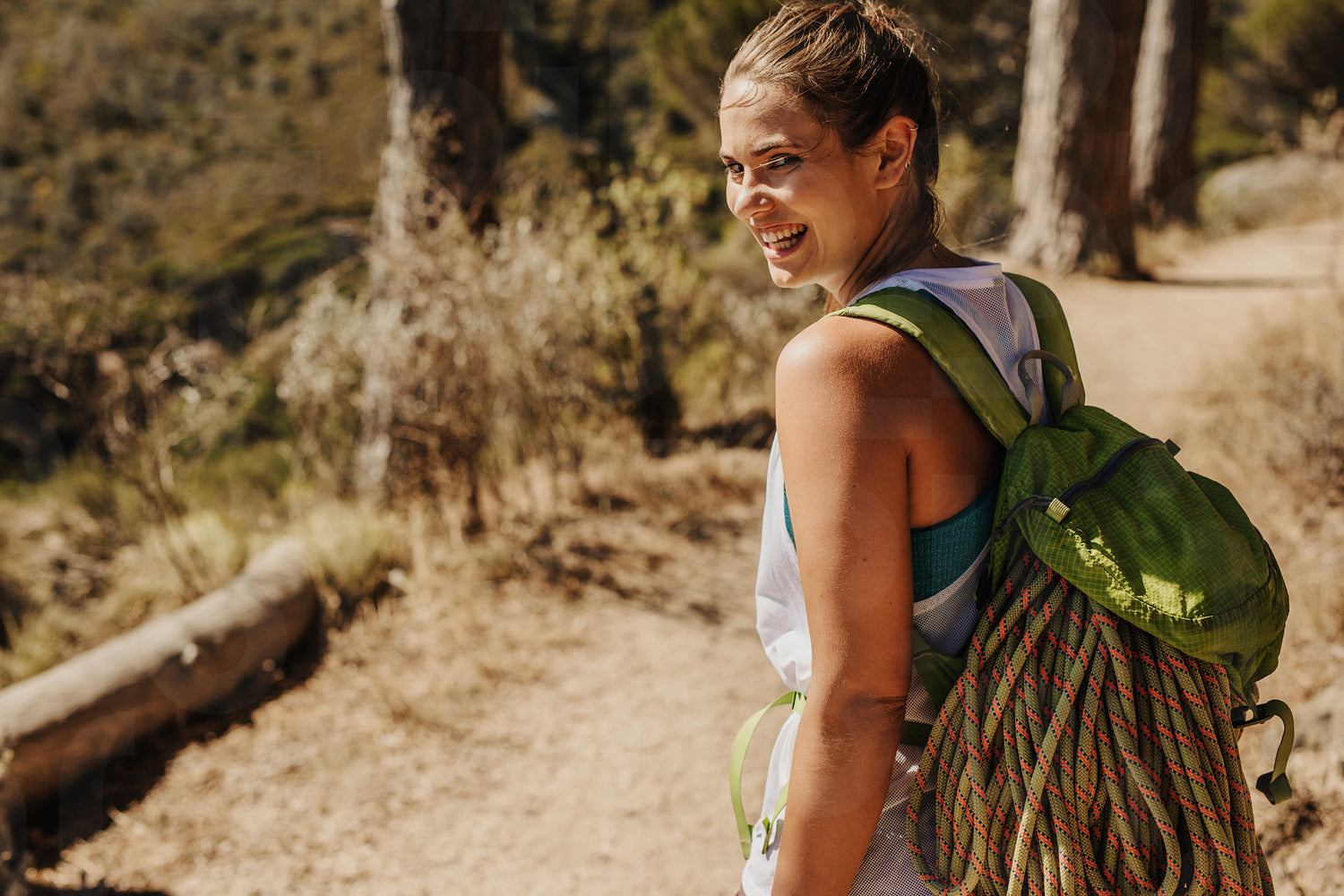 Woman with climbing rope in backpack hiking up a mountain. Female mountaineer looking back at the camera and smiling while walking on mountain trail.