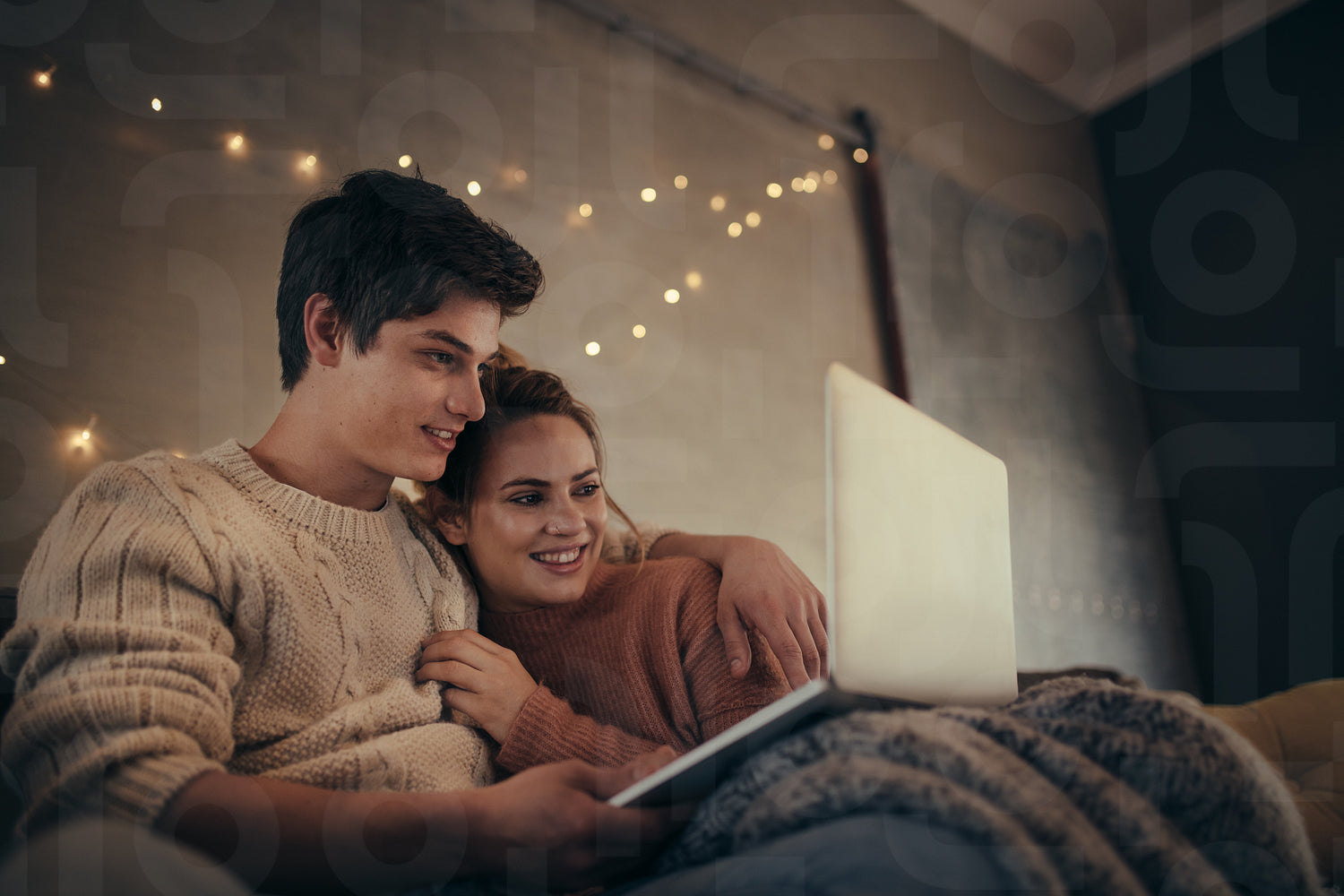 Relaxed young couple sitting on sofa and using laptop at home. Couple with laptop in cozy living room.