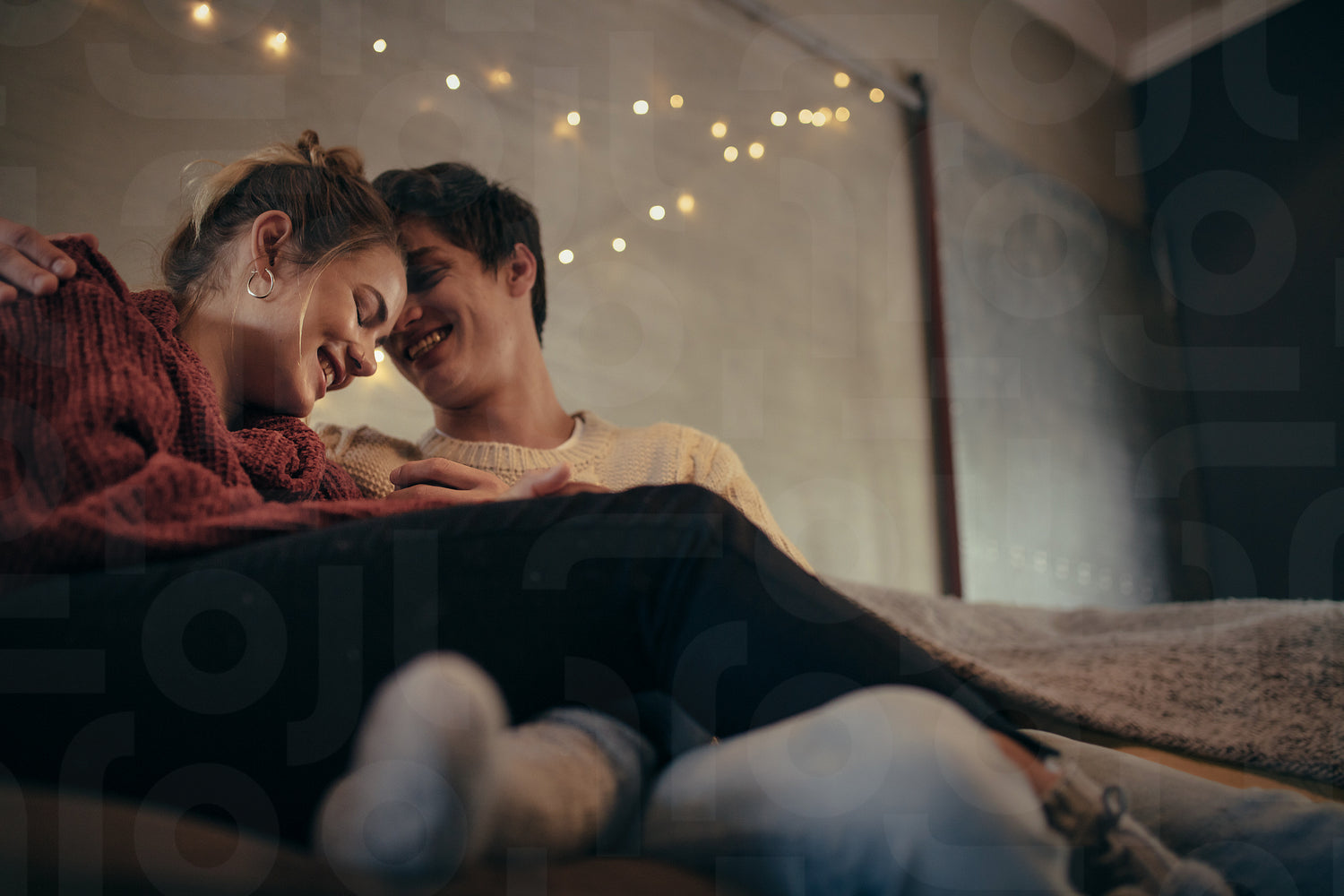 Romantic couple relaxing on couch at home