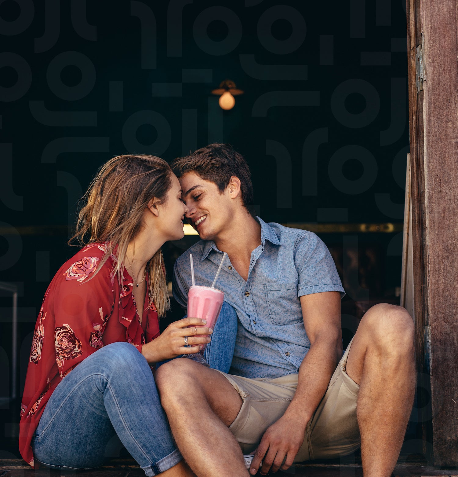 Man and woman sitting down together touching their heads holding a glass of milkshake. Couple in love sitting at a restaurant outdoors.