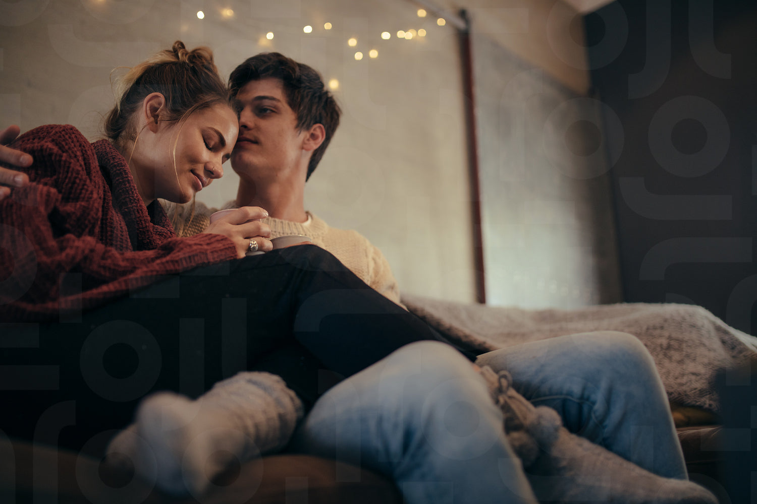 Cozy couple sitting together on couch at home. Romantic man and woman relaxing in living room.