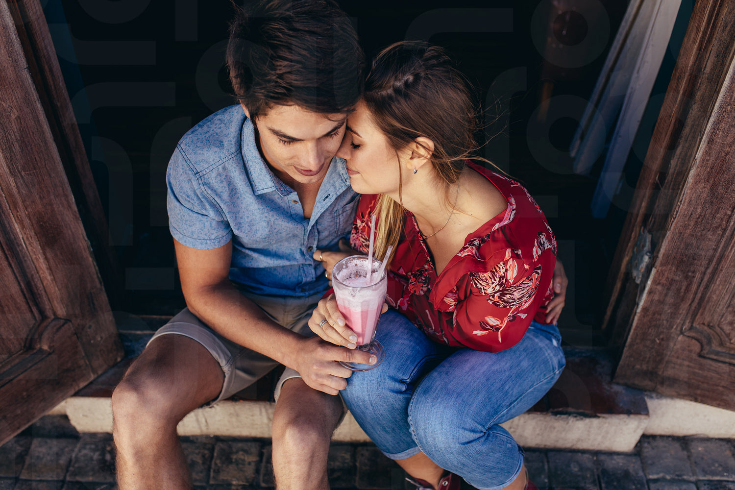 Romantic tourist couple sitting at the doorstep with a milkshake