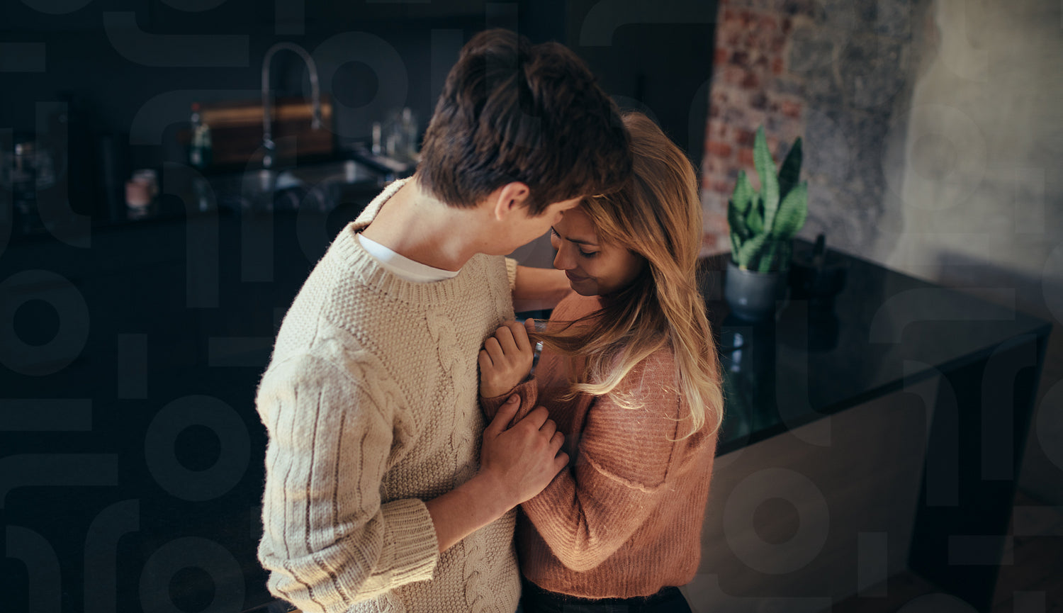 Romantic young couple embracing in the kitchen at home. Man and woman in love together at home.