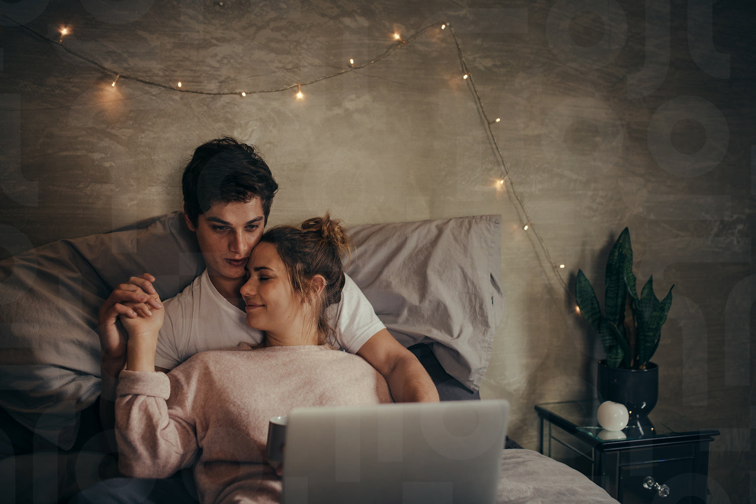 Romantic young couple with laptop on bed. Man and woman in love watching video on laptop while relaxing in bedroom.