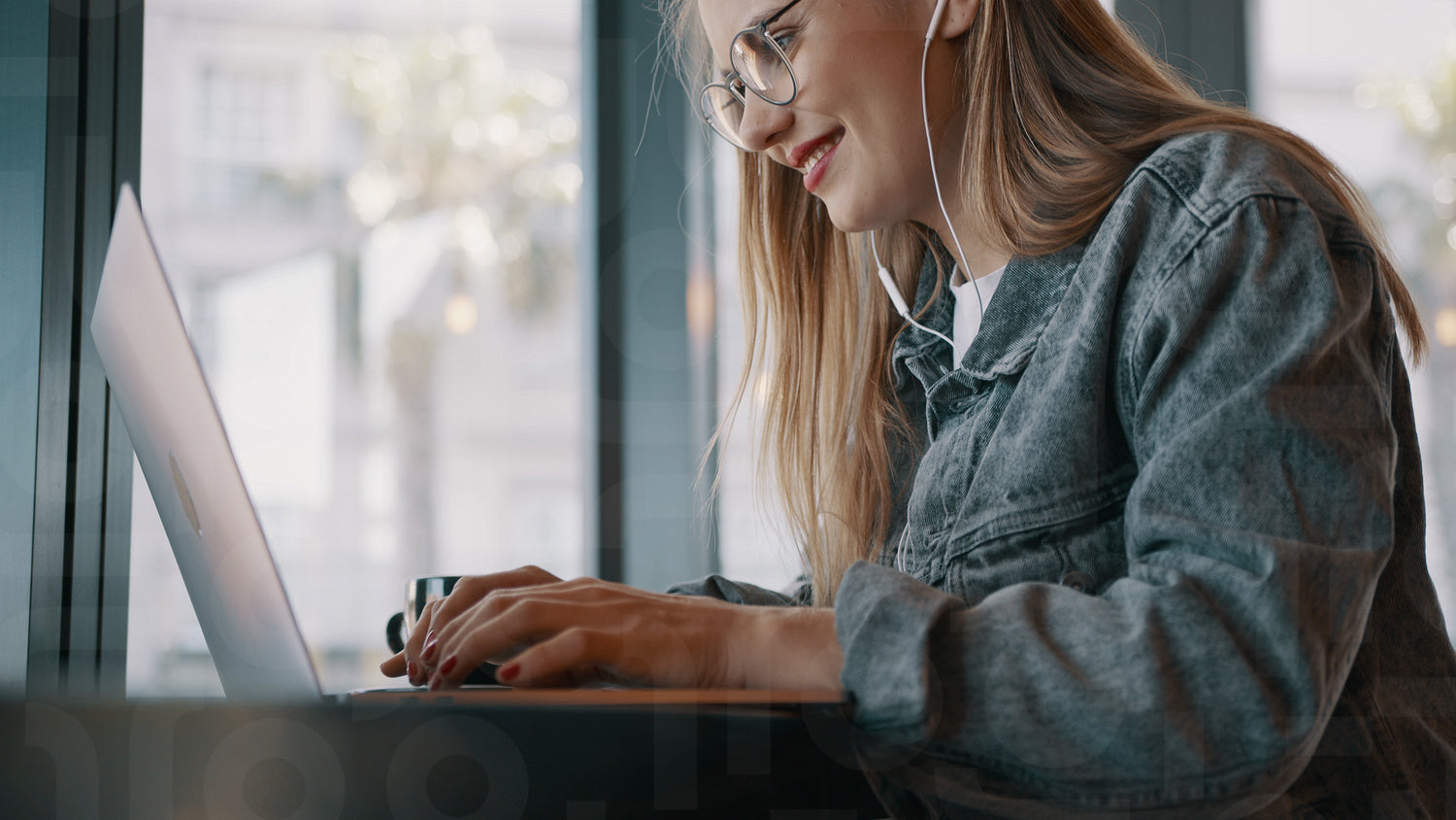 Smiling woman busy working on laptop at a cafe