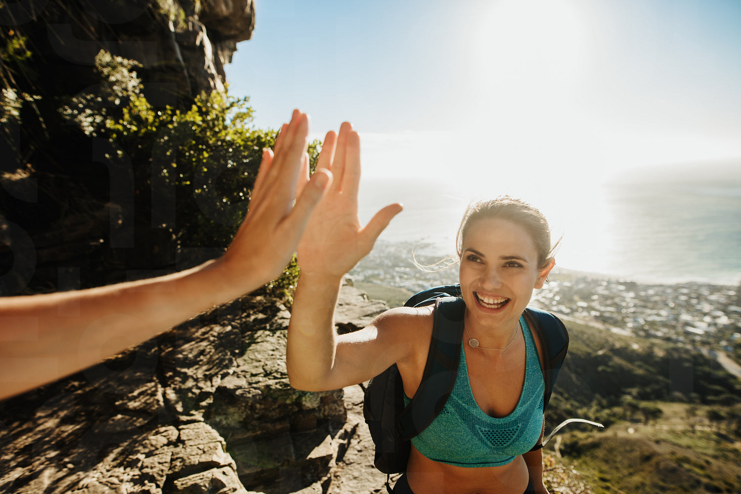 Female hiker giving high five to her friend on mountain top. Mountaineers giving each other high five on cliff top.