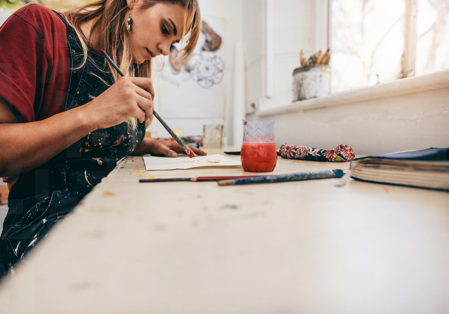 Image of beautiful woman drawing pictures in her workshop. Female artist painting in her studio.