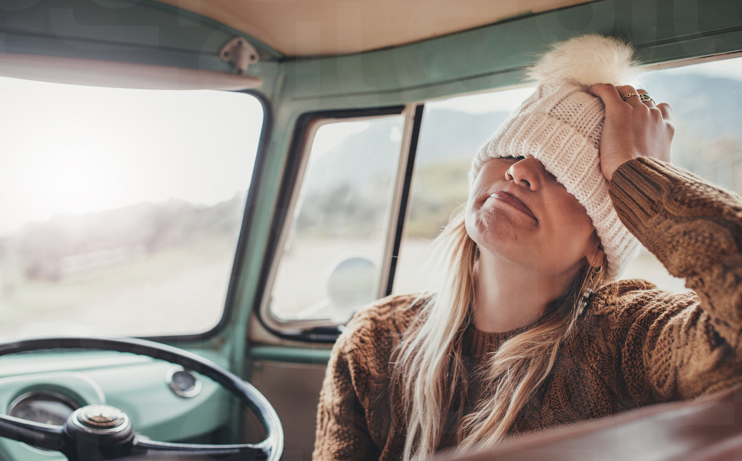Woman on a road trip. Young female wearing warm clothing sitting in van making funny face.