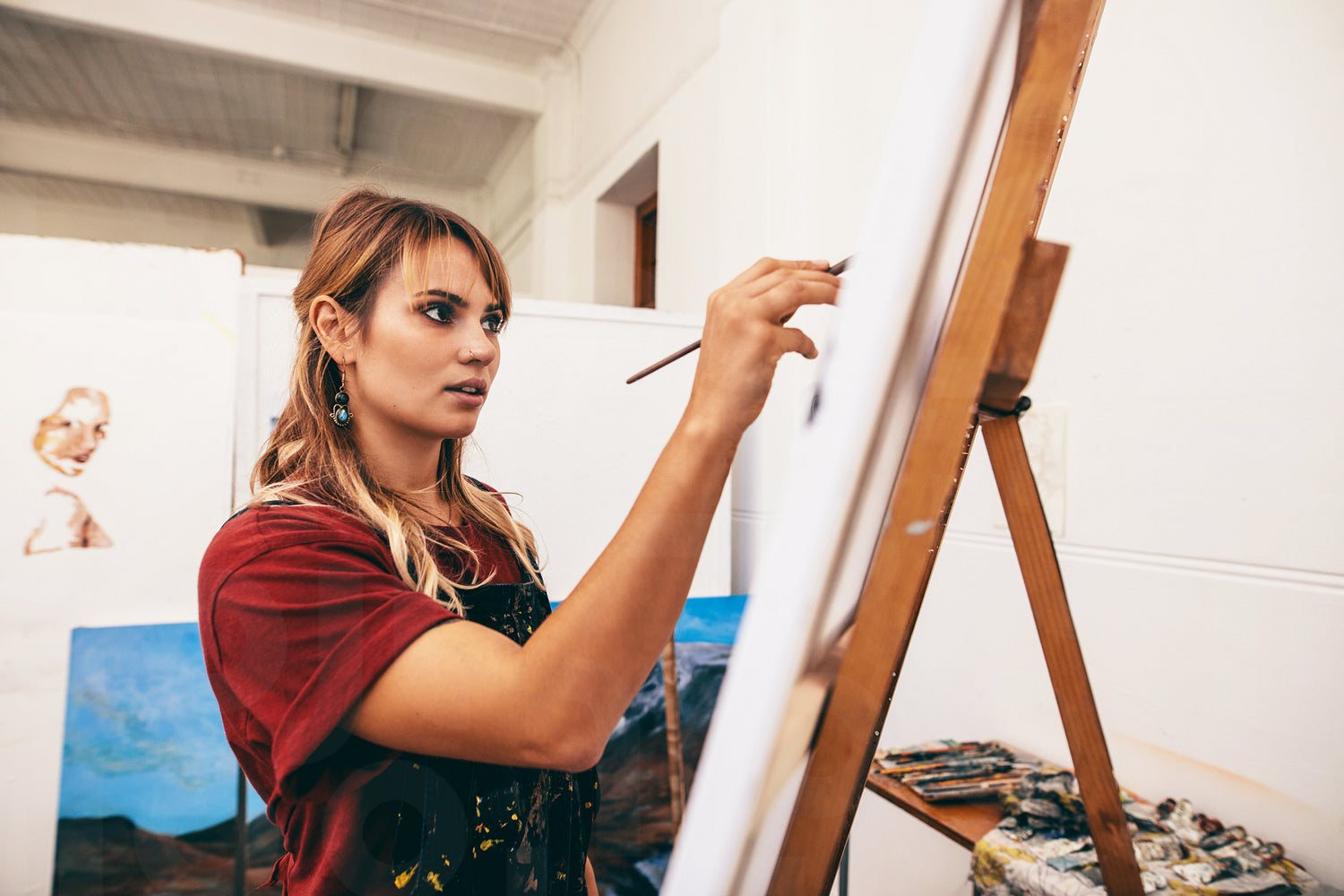 Beautiful female artist making a drawing on easel. Woman painter painting on canvas in her studio.
