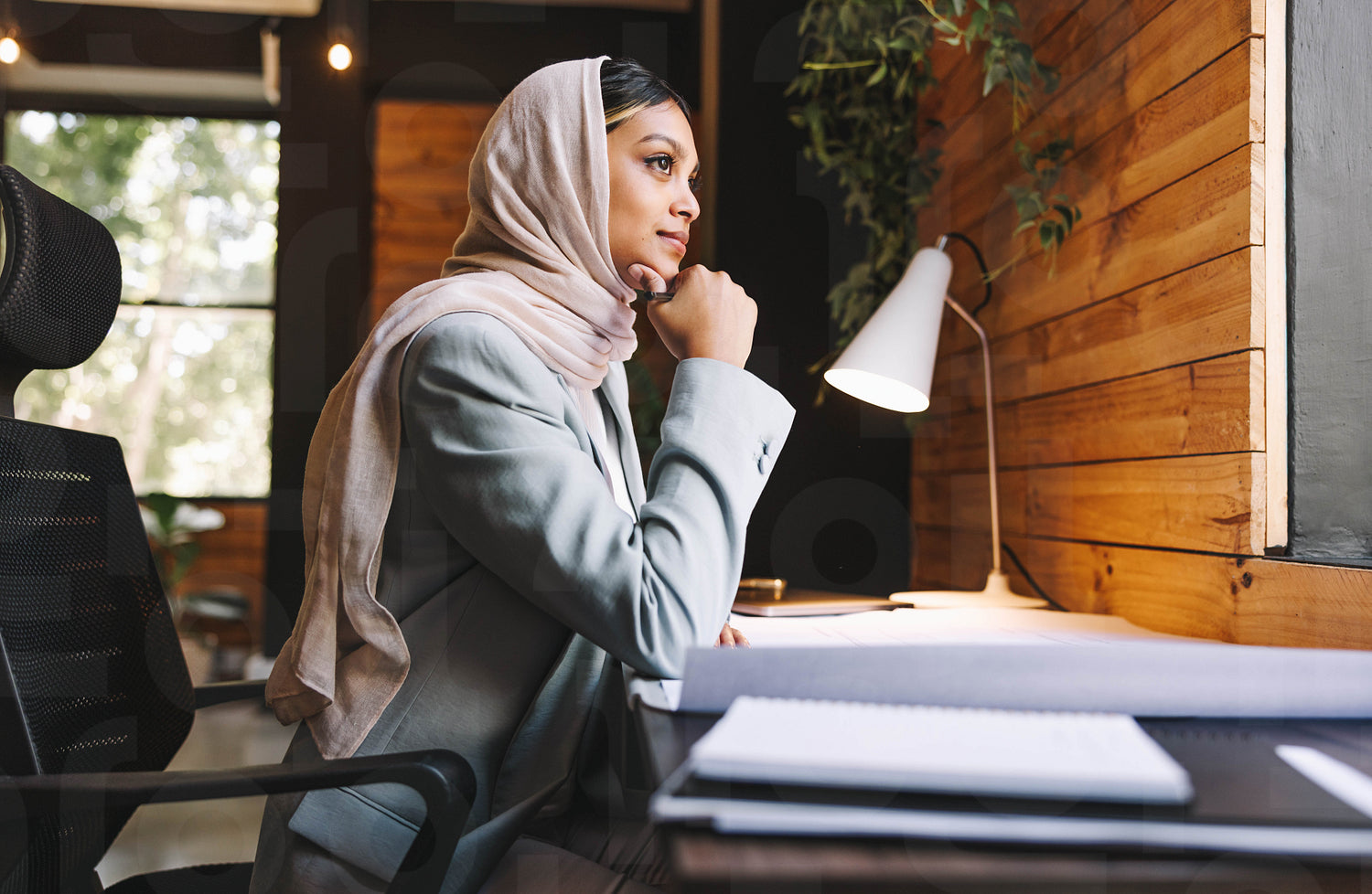 Ambitious Muslim designer thinking of creative ideas while working with architectural blueprints in a modern office. Innovative businesswoman wearing a hijab in an inclusive workplace.