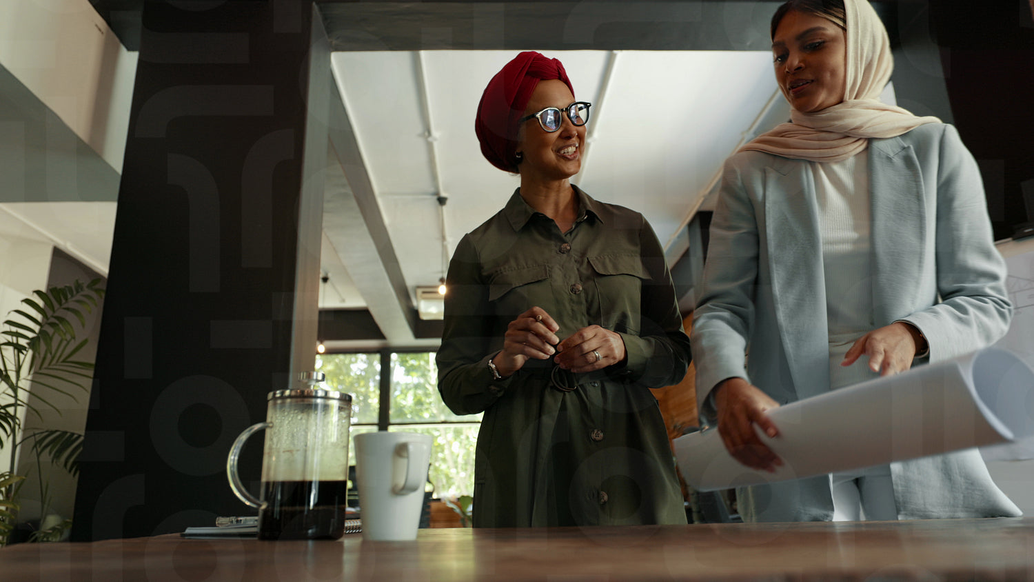 Architects wearing headscarves reviewing blueprint drawings in an office