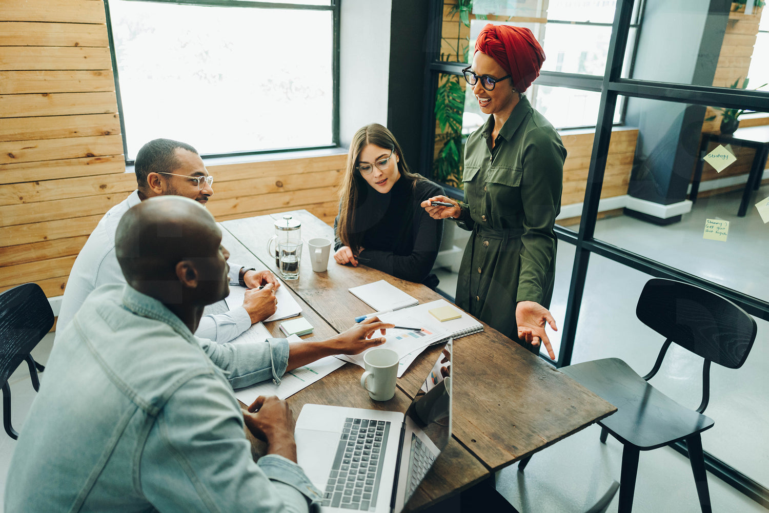 Team of multicultural businesspeople having a discussion during a boardroom meeting. Group of diverse business professionals sharing creative ideas in an inclusive workplace.