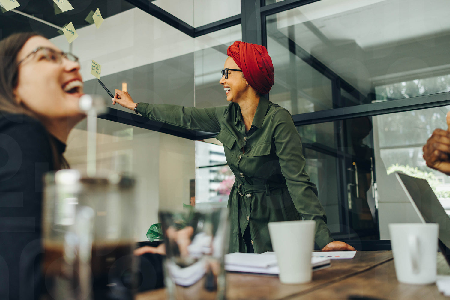 Team leader sharing creative ideas during a meeting. Cheerful Muslim businesswoman using sticky notes while brainstorming with her team. Businesswoman wearing a headscarf in a multicultural workplace.