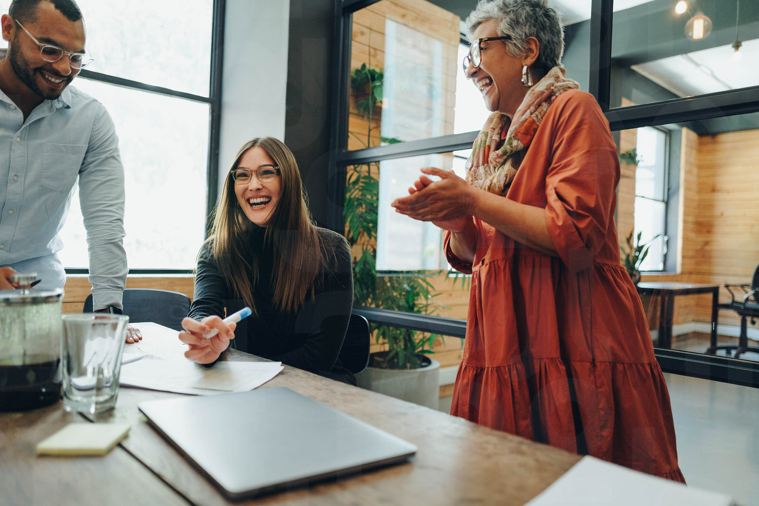 Group of successful businesspeople laughing cheerfully during an office meeting. Team of multicultural businesspeople collaborating in a creative workplace.